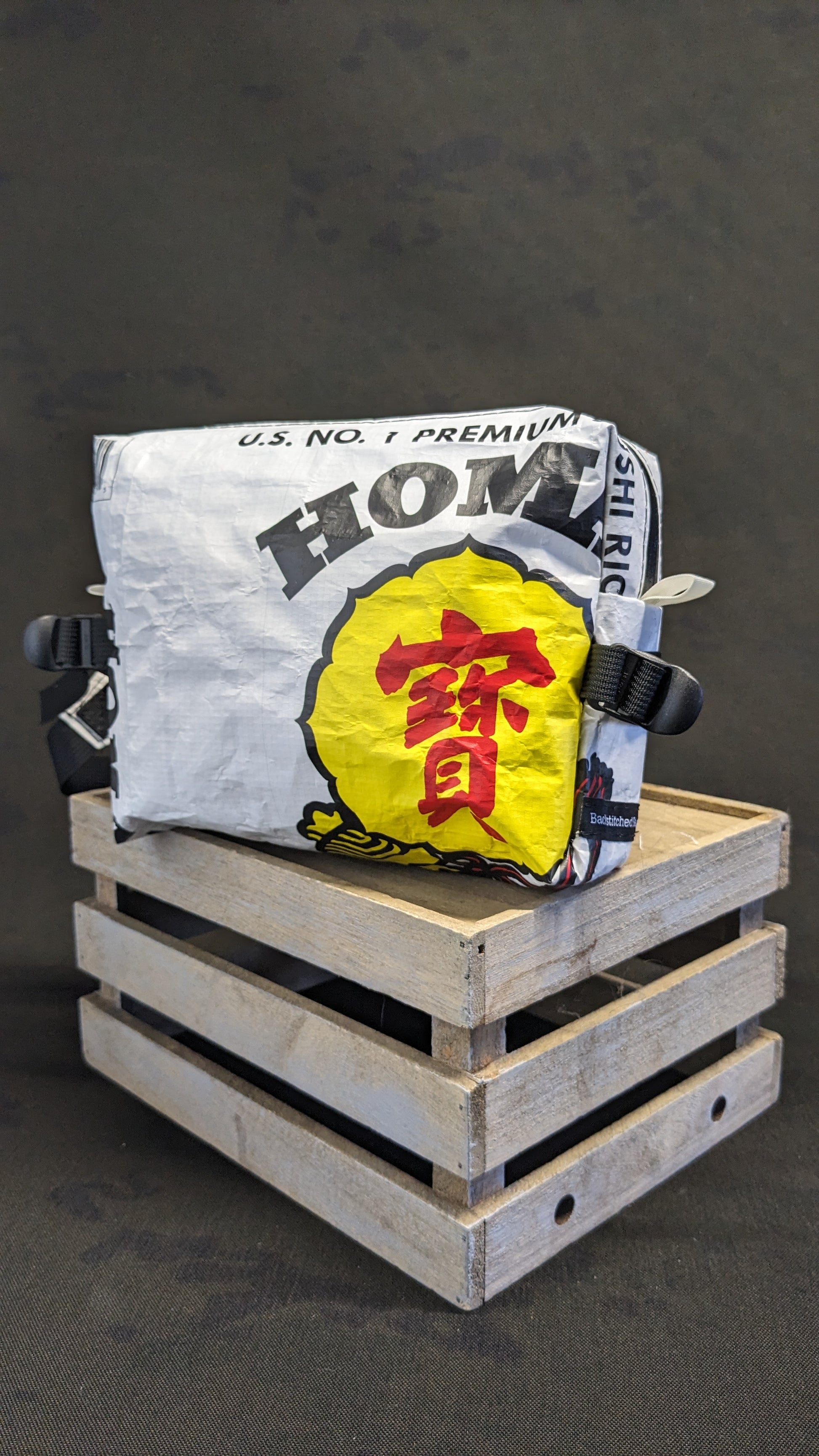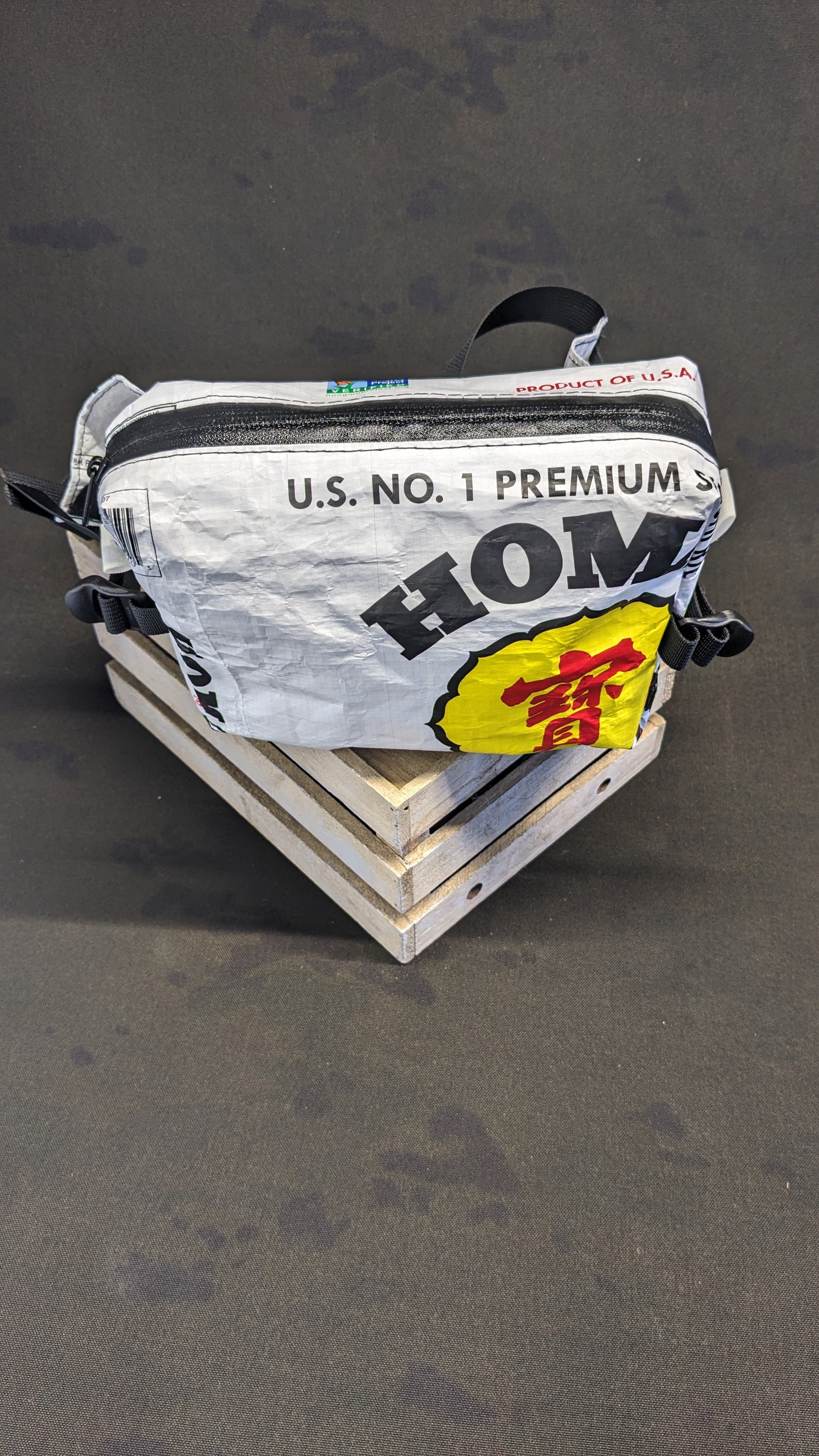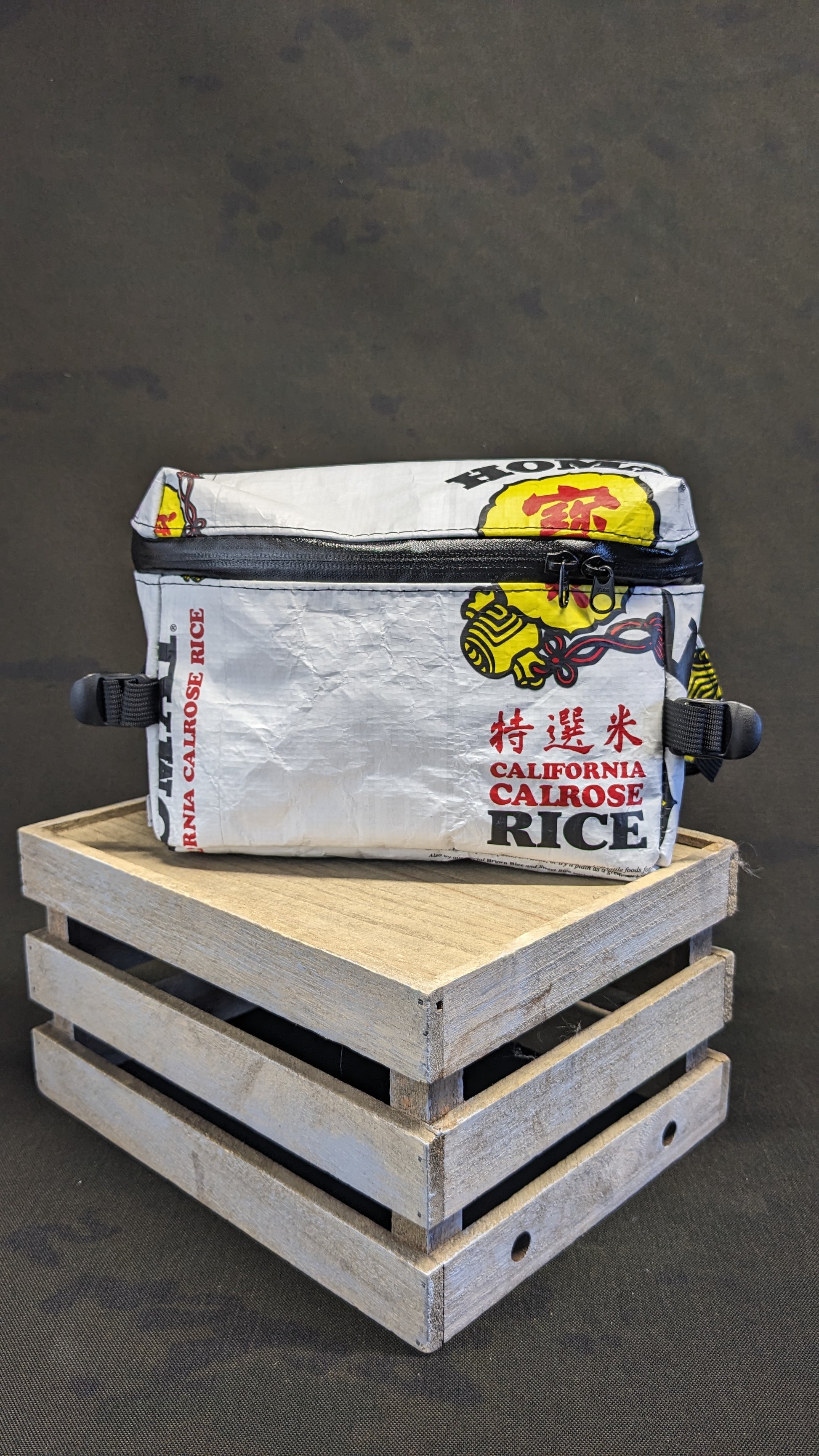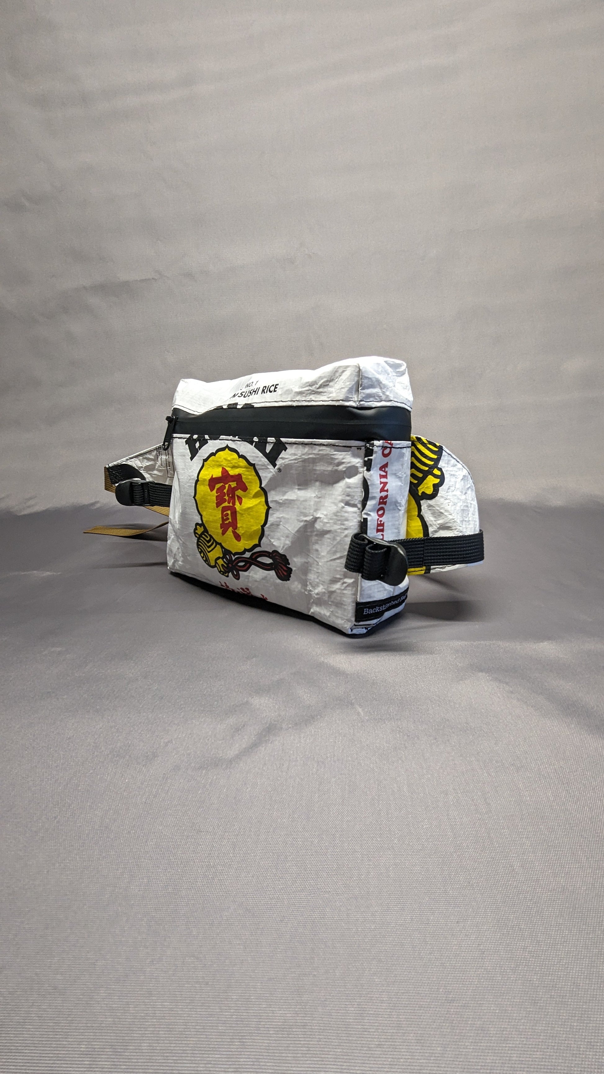 This classic hip pack design is made from upcycled bulk rice bags. The bulk rice bags are light weight, sleek and highly water resistant which makes them the perfect material for an everyday hip pack. A large, two liter zippered pocket houses bulky items while a small internal sleeve pocket and Velcro pocket hold smaller items. Hip load straps keep the pack weight snug to the hips or across the body and prevent bouncing.