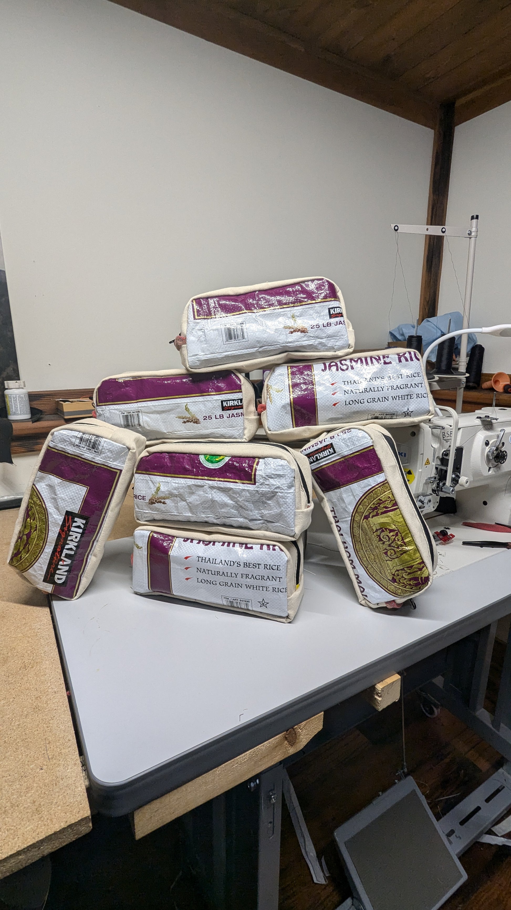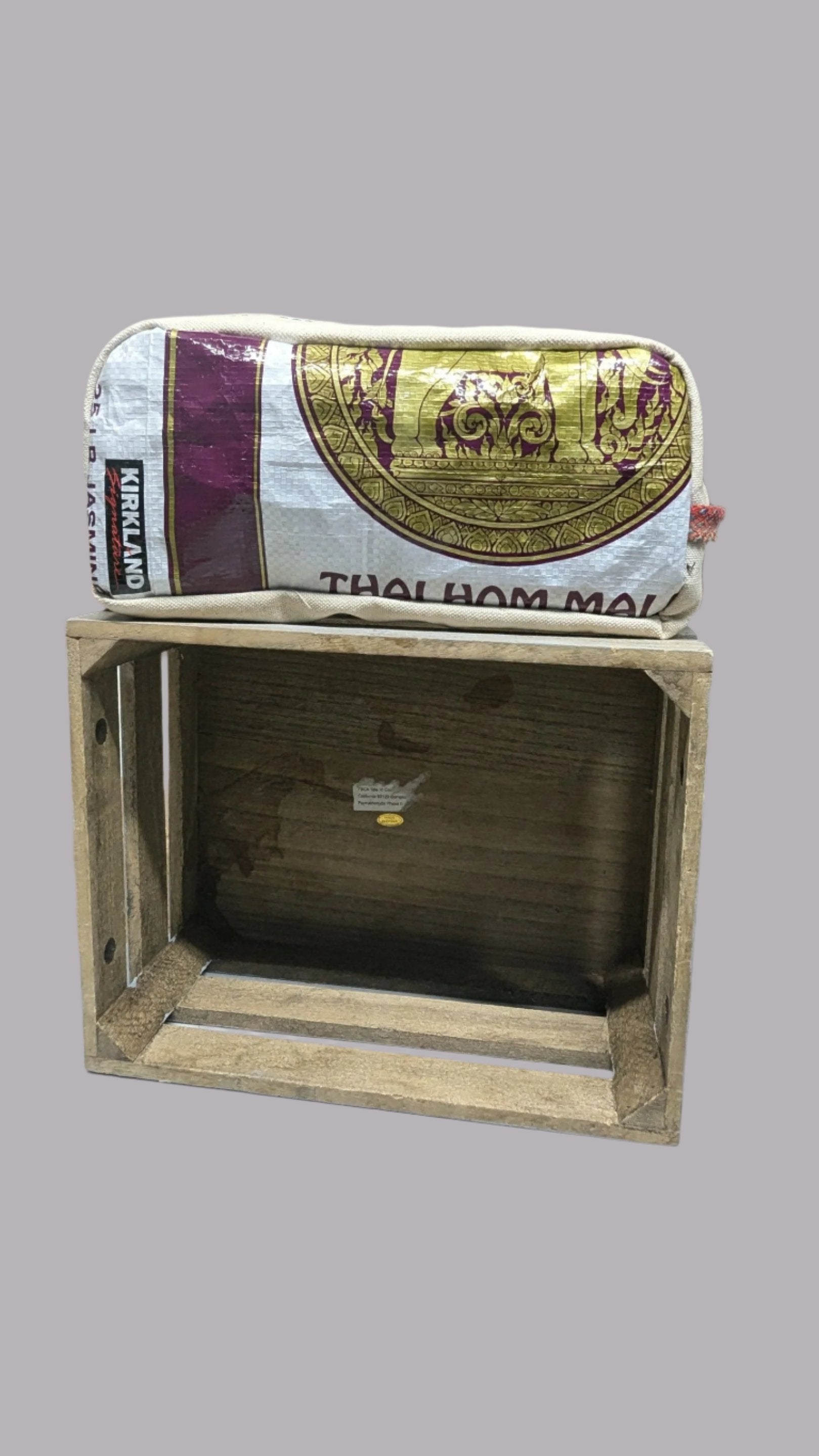 These dopp kits are made from deadstock canvas, bulk rice bags and a touch of old climbing rope as the handle. Each upcycled kit has a large zipper access, lined interior and an internal pocket. Fits common toiletries, snacks, back country camp games, art supplies, dog treats, you name it!